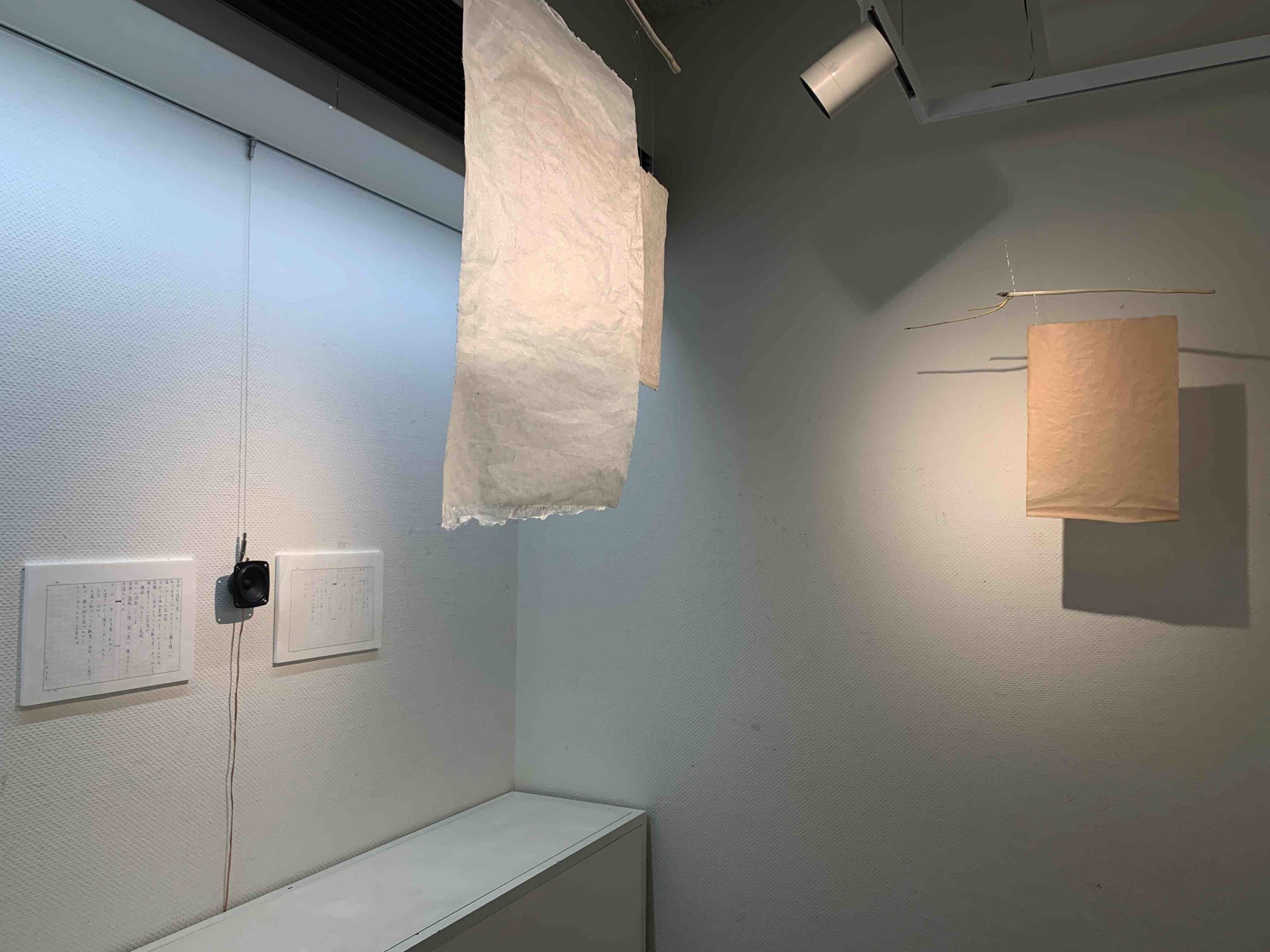 壁掛けのスピーカーから流れる朗読の声を音声メディアとして、ワークショップ参加者の直筆とともに展示。また、「いのちの芽」から抜粋した詩を雁皮和紙に印刷して「透き通る雁皮和紙」とともに展示しました。