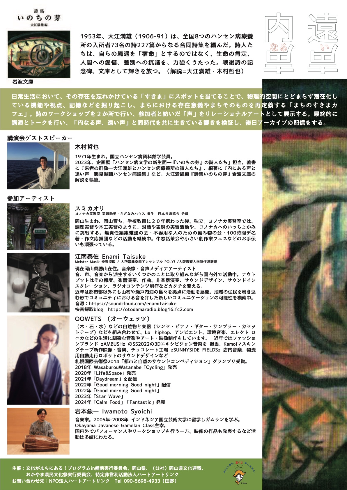 日常生活において、その存在を忘れかけている「すきま」にスポットを当てることで、物理的空間にとどまらず潜在化している機能や視点、記憶などを掘り起こし、まちにおける存在意義やまちそのものを再定義する「まちのすきまカフェ」。詩のワークショップを2か所で行い、参加者と紡いだ「声」をリレーショナルアートとして展示する。最終的に講演とトークを行い、「内なる声、遠い声」と同時代を共に生きている響きを検証し、後日アーカイブの配信をします。